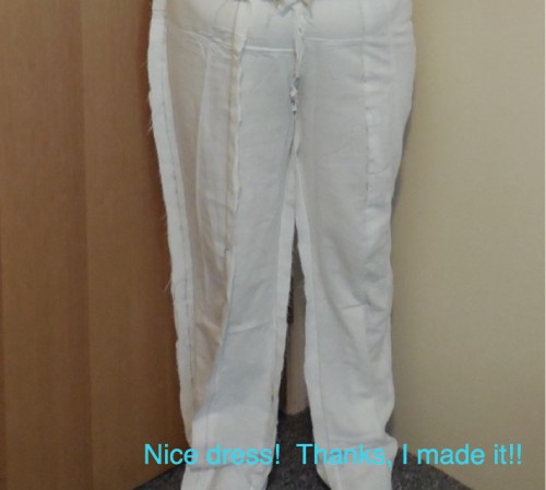 My DH, Mr. Green Thumb, was curious at one point and asked “What are you making?”  “Pants” I say.  “Oh!” he says with a pause “… you’re not going to wear those outside the house… are you?”  I should have told him “Yes, they’re the newest style!  🙂