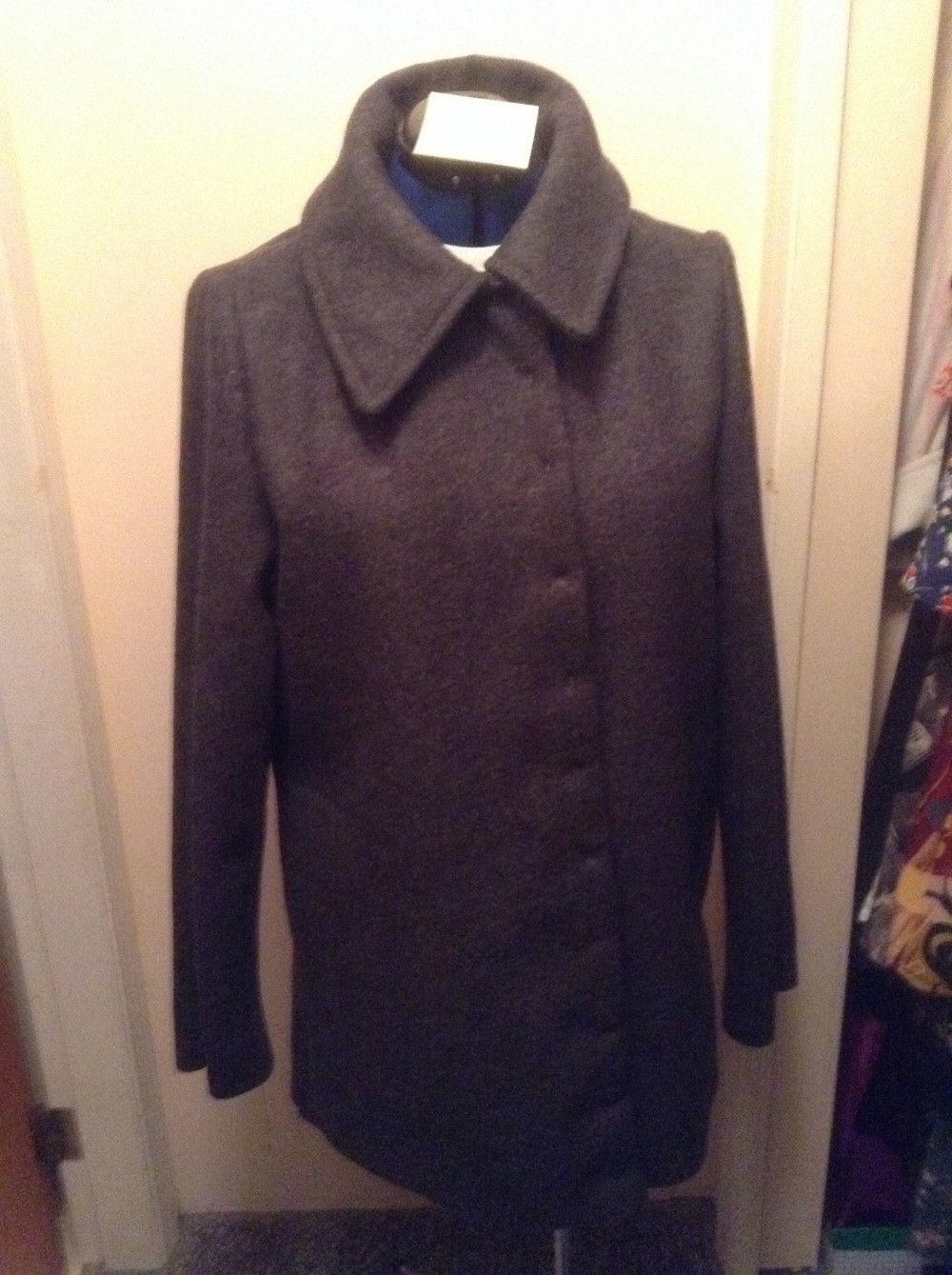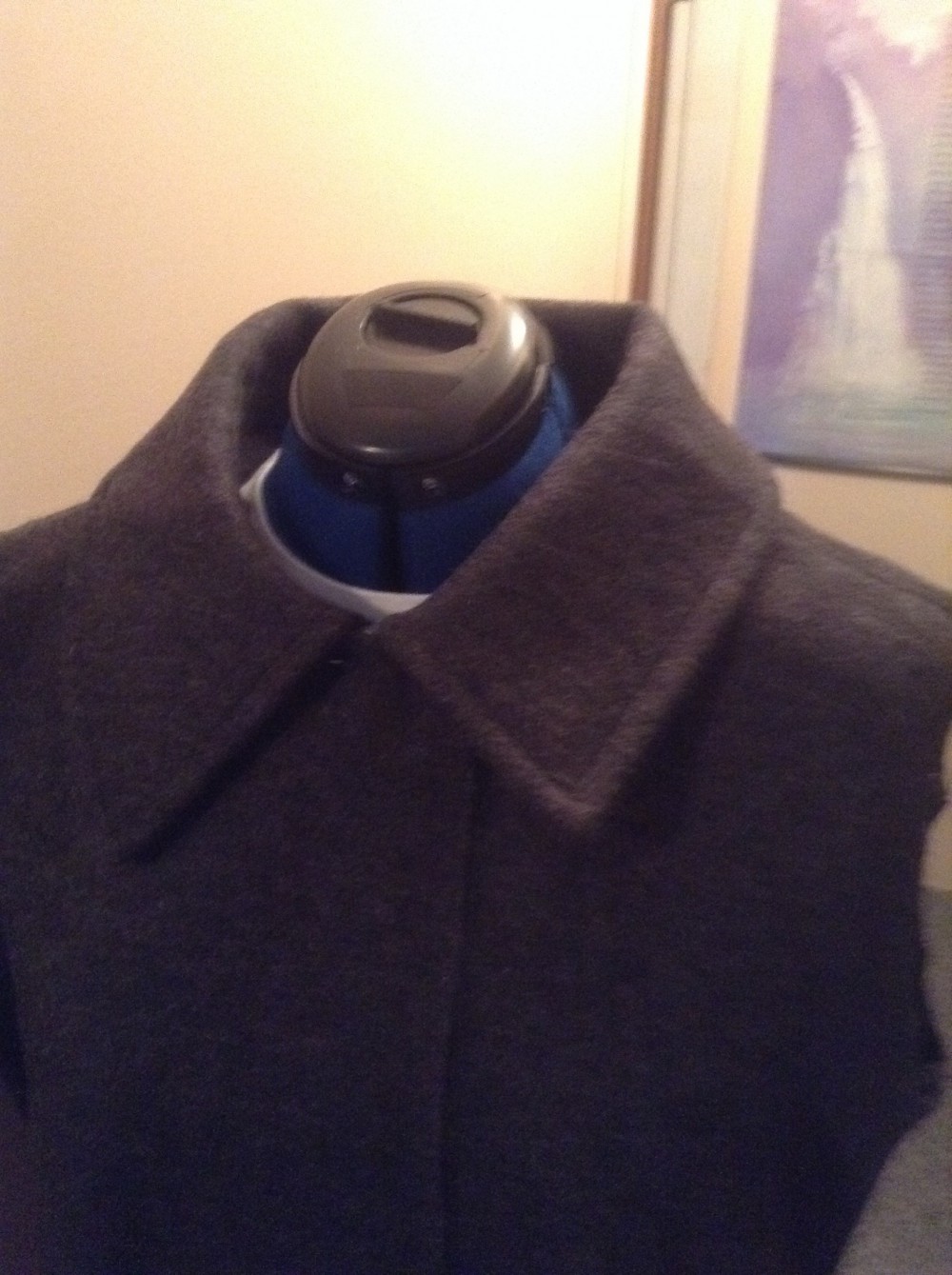 And here we have it… back neck facing done, all assembled and attached to my coat…. So much more to my liking! Perhaps you can see in the end I made the back neck facing a bit shorter. I had cut it on the fold when actually the back was made up with two pieces sewn together – oops! That’s ok, I just pinched the excess and sewed up a seam there. Now it fits perfectly!