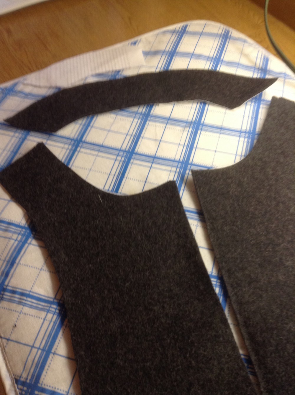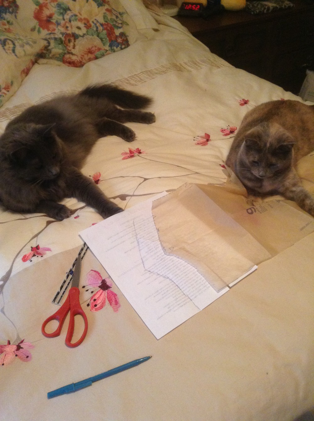 Of course now that I am so close to finishing I have decided that no coat of mine should be without a back neck facing – don’t know why the pattern was made without one, doesn’t make sense to me! So my two apprentices, Simon and Sophie, and I draw one up using the back neckline of the coat. We will piece something together – that is if my apprentices don’t tear everything up first!