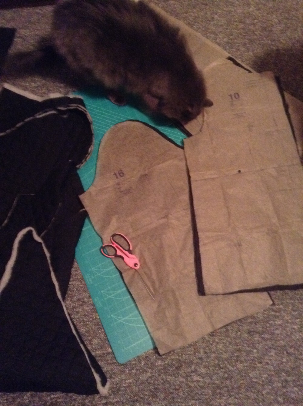And of course now that I am so close to finishing I have decided that no coat of mine should be without a quilted lining. Apprentice Sophie is nowhere to be found, so Apprentice Simon leaps in to help out. I cut the fronts, back and sleeves out of some black quilting and carefully measure and cut some of my front and back lining off so I can attach it to the inside facing I already have.
