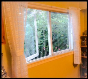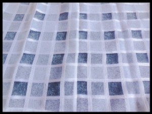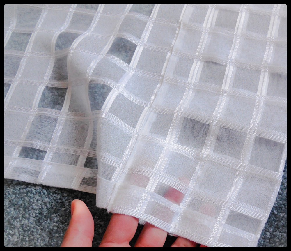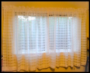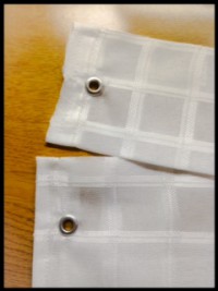 After careful measuring, I cut one of the three panels in half and cut the grommet tops off every panel. I unpicked the store seams on the sides where necessary. I sewed the raw edge of the half panel to a full panel on the side where I had unpicked the side seam. Same with the other half, I sewed it to a full curtain panel. I thought it best that I follow where the factory had sewed the seam together, not to poke too many needle holes in the sheer fabric, but when I basted the full panel and the half panel together I noticed …