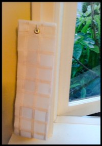 Next, with leftover fabric I made two tubes, 2 squares wide, ironed them, hemmed the ends, and attached small grommets on the ends.