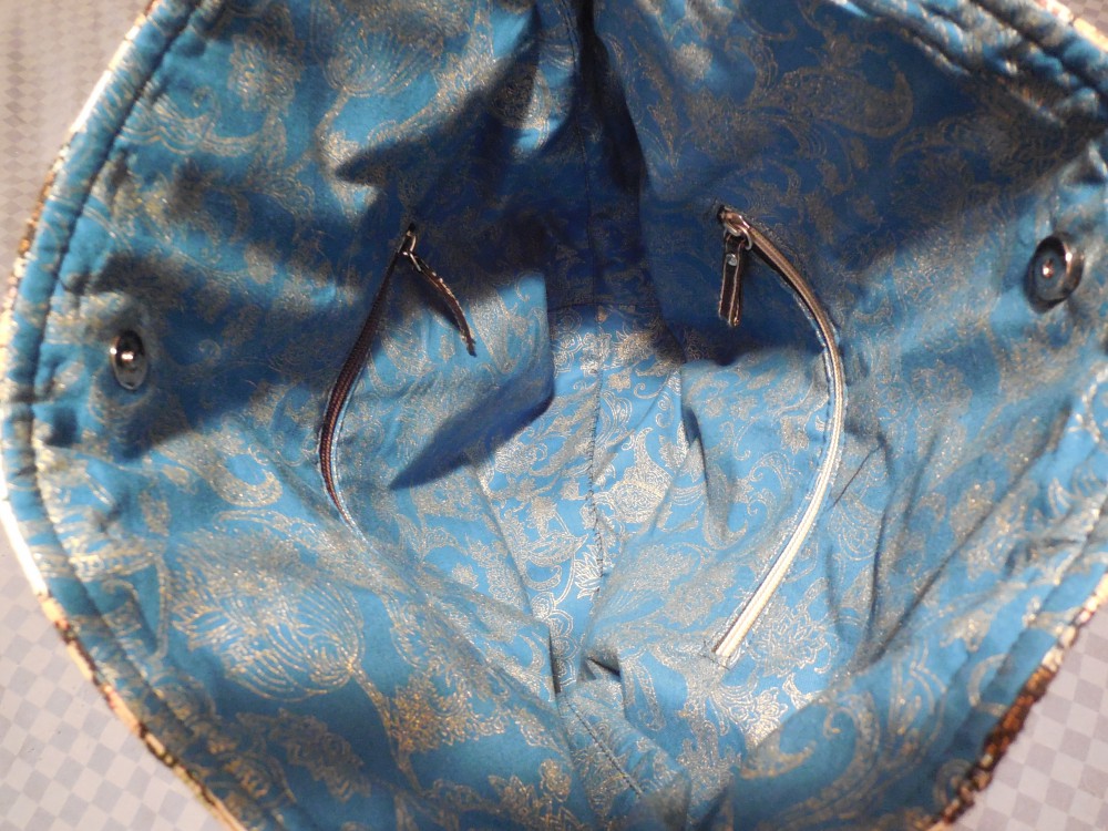 Ok, just kidding, push the lining inside your outer bag, topstitch the bag opening, hand sew up the turning hole in the bottom of the lining bag, attach your straps and you are done! ย Here’s the inside of my bag.