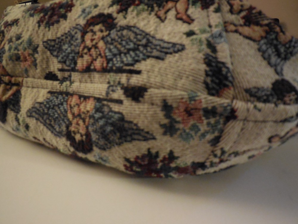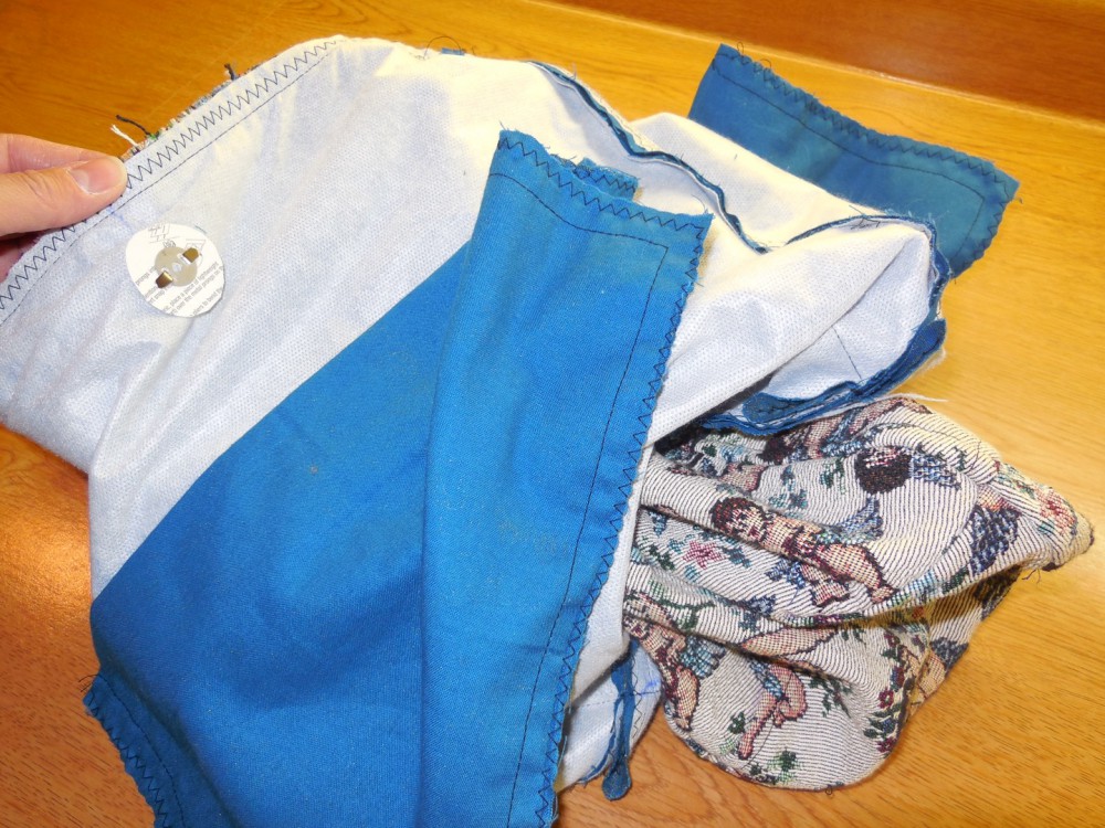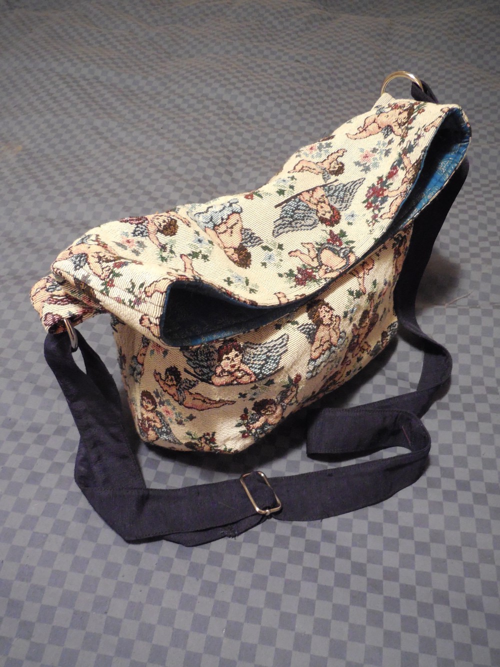 I downloaded myย free PDF sewing pattern for The Sling Bag from Sewing Patterns by Mrs H. ย I gathered together my materials. ย My leftover cherub tapestry fabric for the outer layer of the bag and my purchased blue and gold cotton for the inner lining. ย I could use my blue cloth straps leftover from another project. ย I thought of using my embroidery patch given to me by Sewing with Scoobys as a front pocket, but since it is a “slouchy” bag I figured it wouldn’t be showed off at its best. ย (I still have “sewing up a pair of jeans” on my “sewing to do” list so I could use my embroidery patch then!)