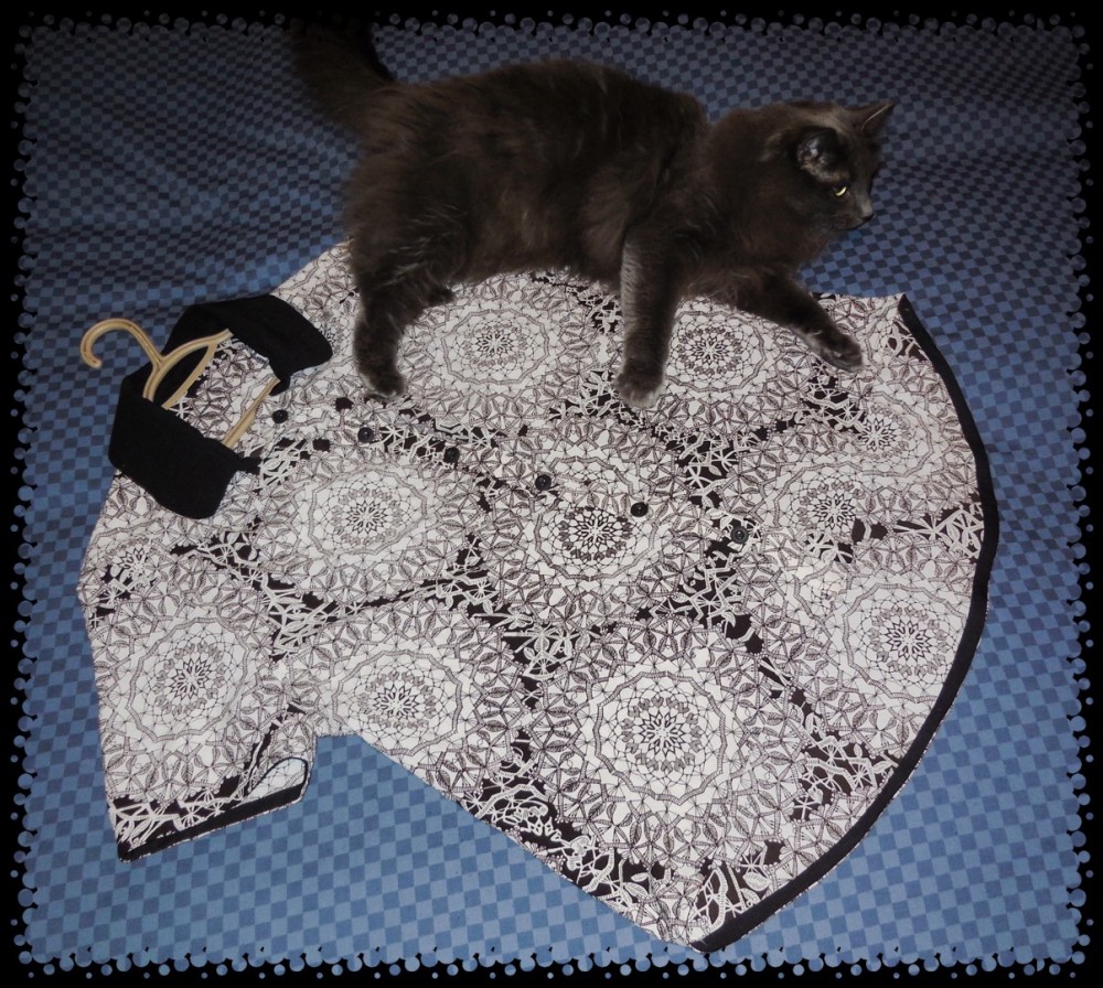 I’m surprised I never finished this shirt right away as I love this fabric! ย Then again, I am glad I didn’t finish it right away as by the time I did get around to sewing it up, I had some black remnants that I could use for the contrasting collar. ย My pattern was McCall’s M6606, view C with the hem line of view B. ย I’ve never had a shirt with a short hem line in the front and a long one in the back. ย A novel idea for me! ย My fabric was a 100% polyester called “Chiffon”.