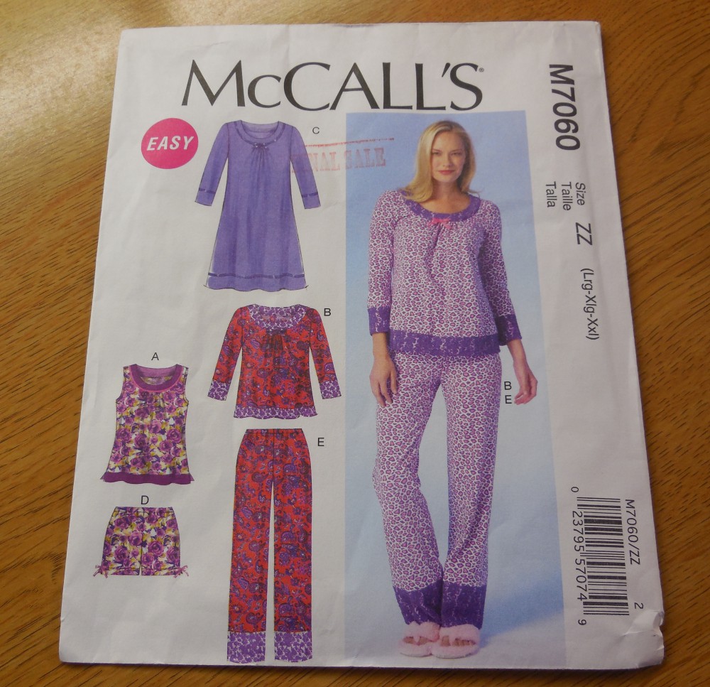 The other week I showed you my housecoat, which I did up, mostly, without a pattern. ย This week I’ve got the PJ’s done. ย I’m using an EASY pattern, McCall’s M7060. I could have probably used the same bodice sloper I used for my housecoat, as there isn’t much to the PJ top, but hey! sometimes it is nice to just follow the directions given you.