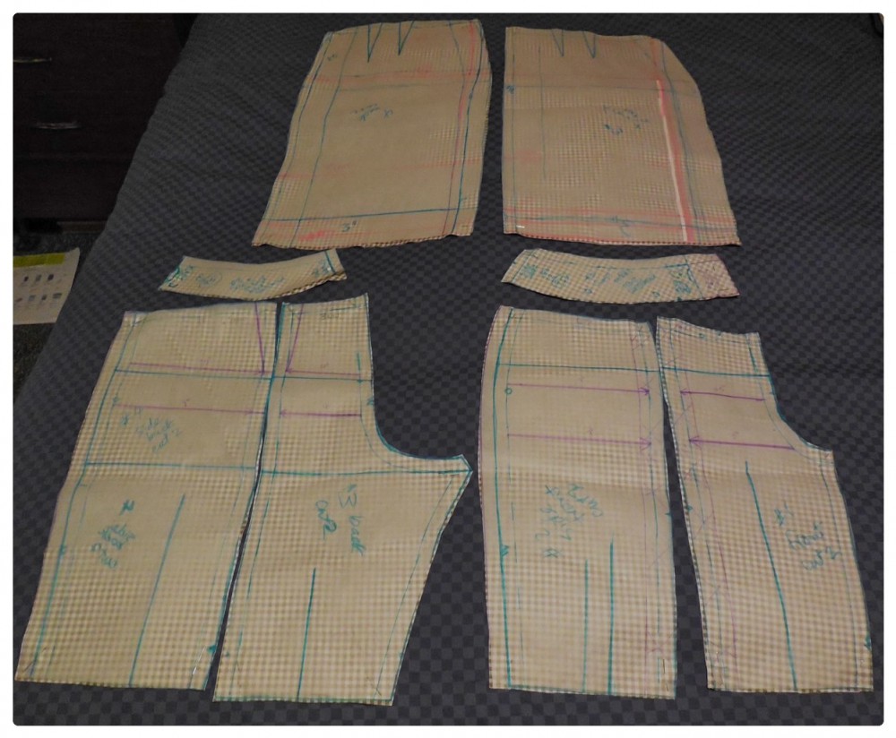 I cut my fitting shell piecesย out of my gingham fabric again. ย  (Notice the extra pieces I cut out? ย I am working on a Pants Fitting Shell too. ย But that’s another story!)