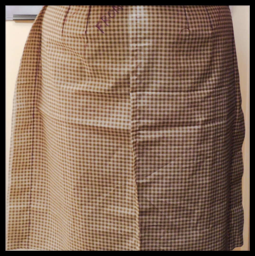 My finished Skirt Fitting Shell! ย (Again, I sewed it together with the seam allowances out, so that I could see the changes I made. ย Not something that is required.) ย Here’s the front … ย I might make the front darts a little bit longer to take in the extra fabric, to make smoother front. ย What do you think?