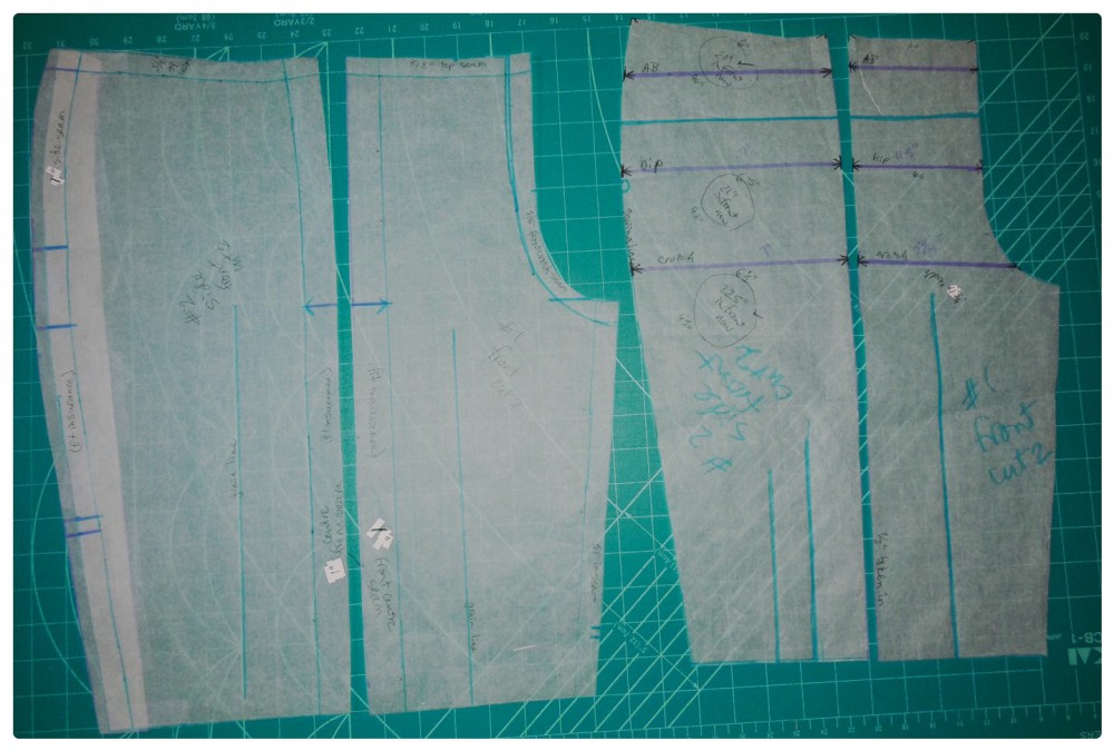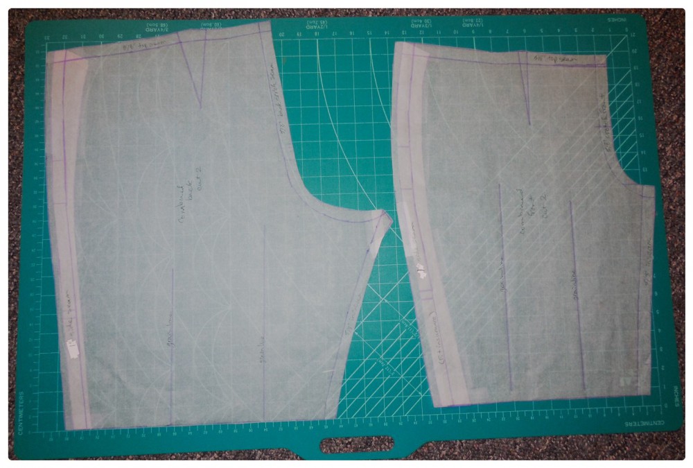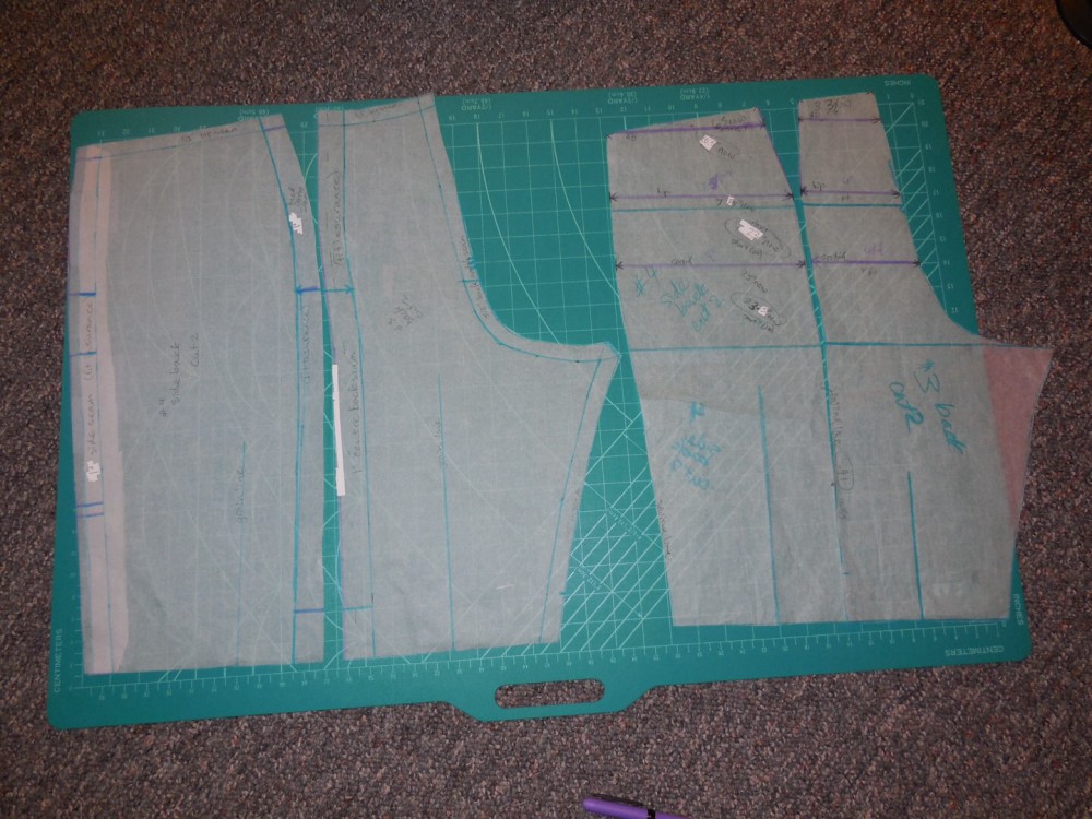 I started by transferring my specific measurements onto the Fitting Shell Pattern tracings I had made, making adjustments as I went along. ย I ended up with sloper pieces with no seam allowances, ease, etc. and retraced those sloper pieces again adding seam allowances and an extra 2″ of fit insurance at the sides.