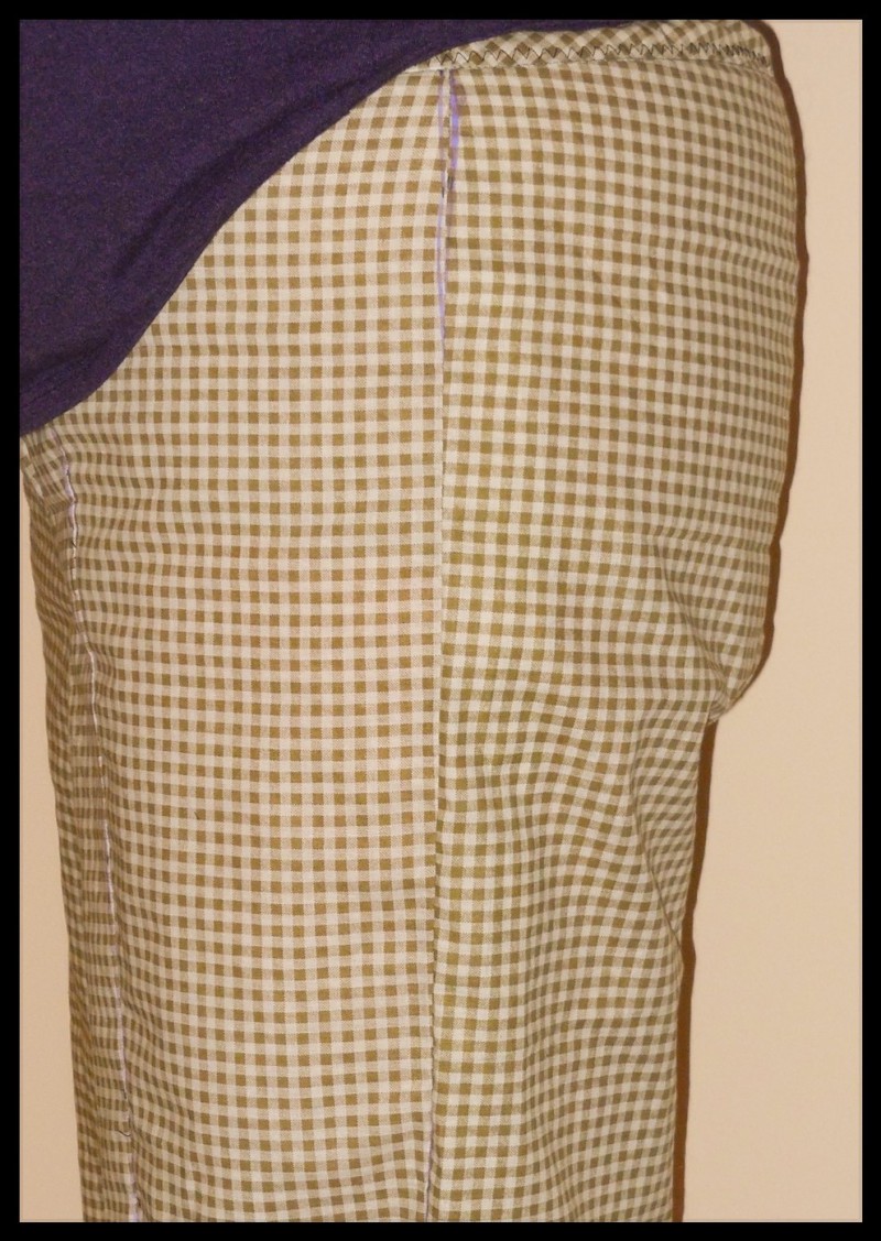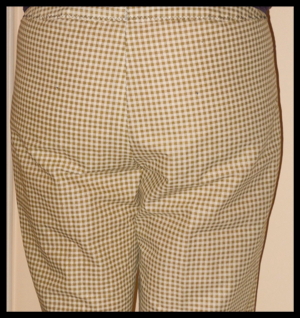 Next I combined my two front pieces to make one pattern piece, adding in a dart at the gap in the waist line and retraced it. ย I did the same with my two back pieces. ย I sewed my pants up inย my gingham cotton again.