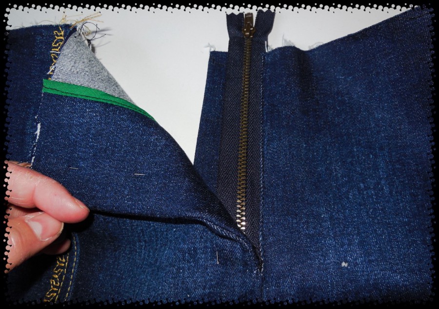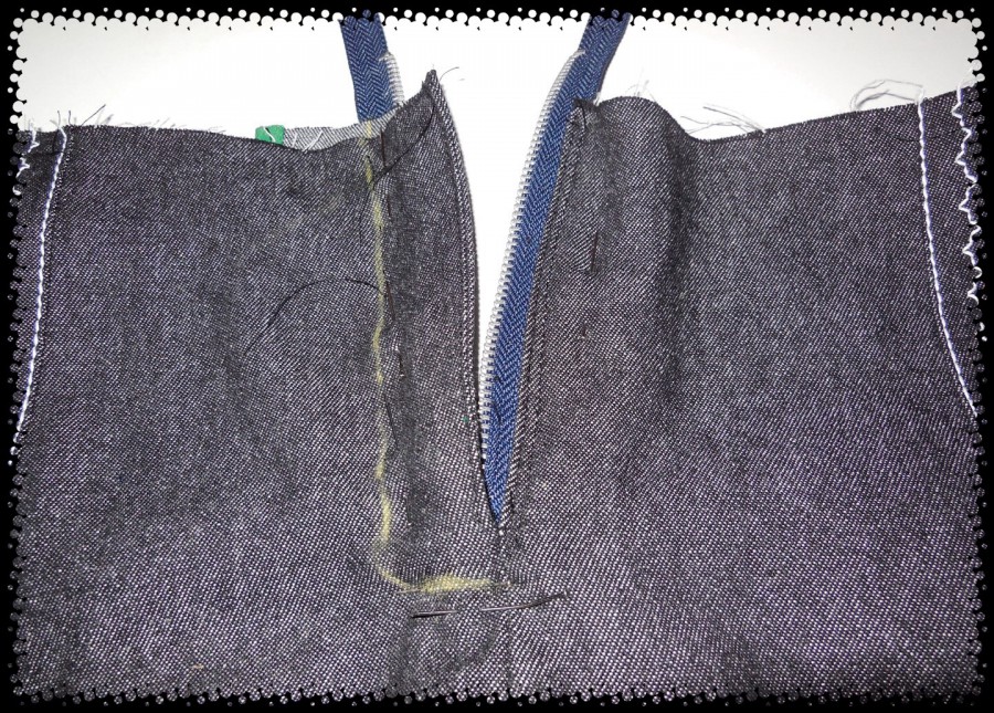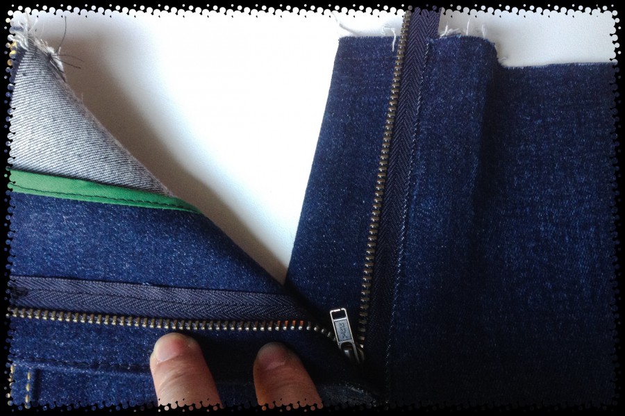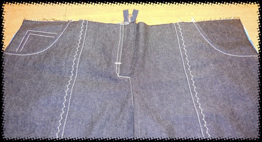 Finished fly front, distressing and topstitching on my blue cotton jeans. ย I just love the fold lines I distressed into the front of my jeans – so cool! ย All thanks to Angela Wolf! ย Before topstitching I did distress some more in the zipper area too. ย There was a bit of a problem because where I wanted to sew two rows of topstitching, I couldn’t, because one of the rows would have landed where the metal zipper stopper is. ย I ended up squeezing in a single row of dark stitching, to hold my zipper, above the zipper stopper, and a double row of fancy topstitching below the zipper stopper, just for decoration. ย You shouldn’t be looking there anyway!