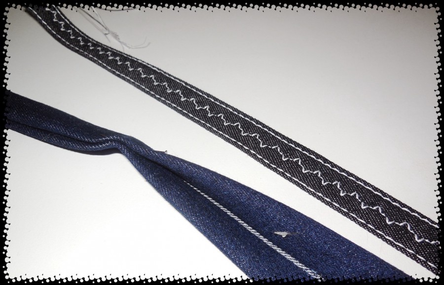 Then I made the belt carriers. ย Those were just as fun as the patch pockets! ย The instructions were to sew the right sides of one strip together and then turn it out. ย I don’t like turning skinny things inside out so I just folded the edges into the centre and then folded the whole strip in half. ย Pressing and sewing finished them off.