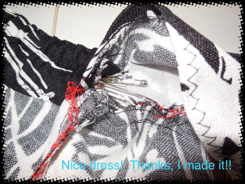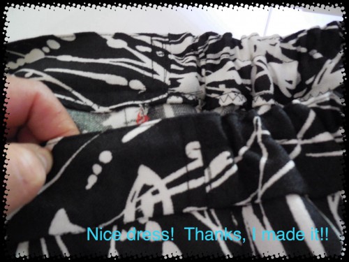 The two narrowย elastics were pulled through their back casings and secured with safety pins to the front waistband (which was still open) and then the elastic ends were sewed down along the side seams.