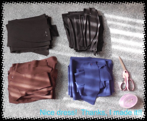 That certainly looks like a few ambitious piles of fabric. ย Let’s start with the brown fabric. ย 67%ย polyester/30% rayon/3% spandex, very soft, not as stretchy as some of my polyester fabrics, but with a bit of stretch. ย It actually reminded me of a heavy yoga pant fabric – maybe not suitable for work pants? ย We shall see.