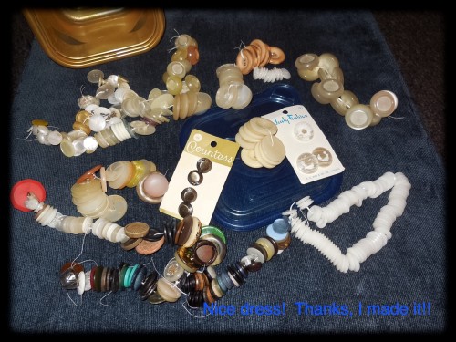 I certainly appreciate all the fabric and sewing supplies I get from friends and family. ย If they ever come across someone getting rid of their “stash”, they make sure to snap it up for me. ย Look at all these buttons my sister found for me! ย She even took the time to string similar colours and sizes together! ย I am sure to find a couple of suitable buttons in here for my sister’s dress.
