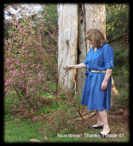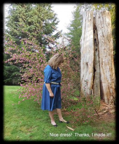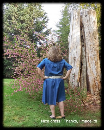Perhaps you remember from my previous post a few of the details… ย I used a cotton/Tencel fabric, similar to jean fabric but much lighter and “glossier”. ย I found the buttons in my stash, lovely gold coloured metal ones with a little crest on on them. ย My stash has actually tripled because my sister brought me more sewing supplies and notions that a friend of her’s didn’t need anymore. ย I love making a new dress without even having to enter a fabric shop!