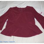 It was easy enough to cut out a new neckline facing that enabled the small slit in the front. ย I didn’t use any interfacing at all on this fabric. ย It is a bit heavier and stiffer than I would want for a summer top, but it is suitable for winter. ย I don’t think interfacing is needed for thisย weight and stiffness. ย I don’t know what kind of fabric it is as it was given to me by a friend. ย It looks and feels like a velvety cordoroy, but it is probably a polyester.