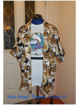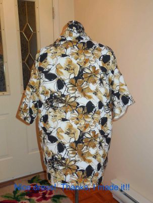 Did I make changesย to this pattern, McCall’s M7200? ย I added a few inches to the length and I made the back only one piece instead of the several they designed into the pattern. ย This patternย has a pretty back with all those seams and a bit of a peplum, but I want my cover ups to be a plain style. ย I ended up with only four pieces – front, back, collar and sleeve. ย (My cover up will be the same, made of the beige fabric.)