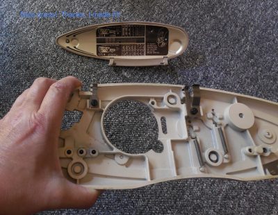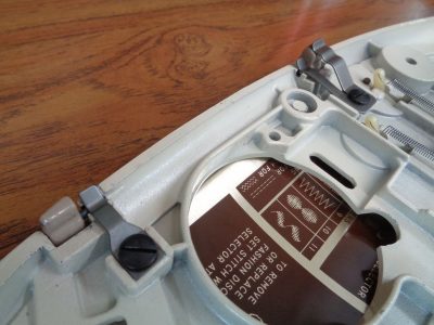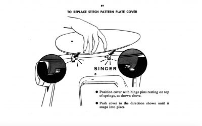 I was determined to clean up and oil Barbie, my Singer Slant-o-Matic 500, my “Rocketeer”, while I was on holidays from work. Before I even got around to cleaning her up … well … I broke off her Plate Cover by accident. I just closed it and it popped off in my hand. The manual showed it was an easy fix – just snap it back on.