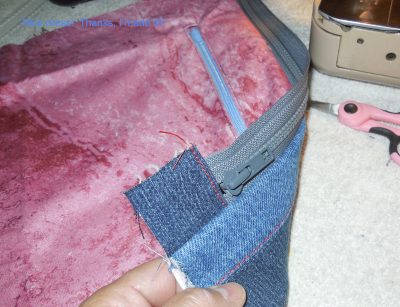 One side done. I have to topstitch (I used regular thread) along the zipper seam to keep the bag layers out of the way of the zipper.