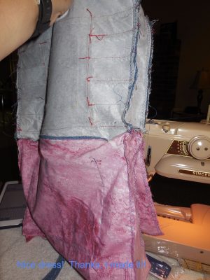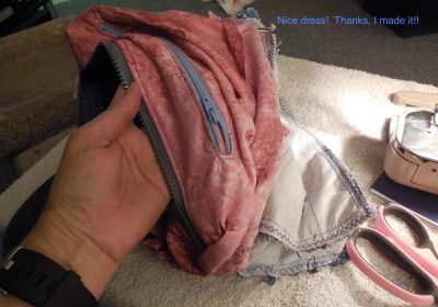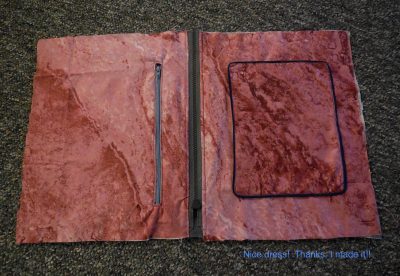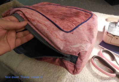This week, I continued on. I prepped the opening zipper, cutting it to the right length and topstitching the zipper tabs on the ends. I switched from the brown zipper to this blue one as it fit around my iPad just right.
