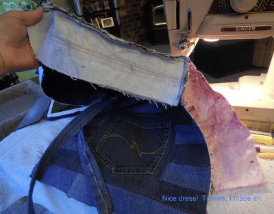 Back again! To recap last week’s post … I wanted to make myself a 100% recycled denim bag, using denim strips like those bags I saw on Pinterest. Last week I cut up my denim jeans, pieced and sewed the strips together and fused on the interfacing for my outer bag walls. I sewed the pockets and the zipper pocket on my bag lining. I sewed the bag strap. I did my topstitching – I love topstitching and Amber, my Singer 421G was a work horse!