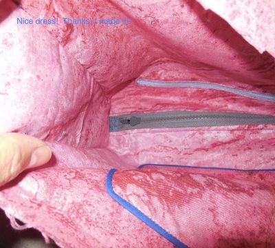 I sewed the ends of the bag strap on to my outer bag wall, along the top edge by each zipper end. Bag sides were sewn on to the outer bag walls (sandwich the bag strap ends inside). Bag sides were sewn on to the bag lining too. By now everything is getting a bit cumbersome, as the only thing holding the outer bag and the bag lining together is the zipper seams.
