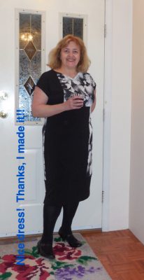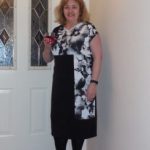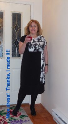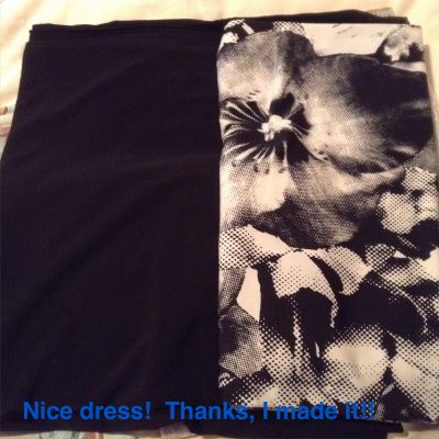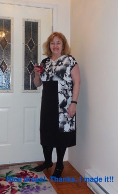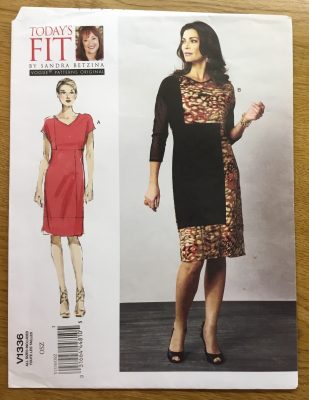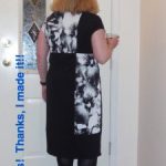 This week I finished my Night dress – my “Cocktails” dress. I used this Vogue pattern, V1336, “Today’s Fit by Sandra Betzina”. I love her patterns. There is nothing better than looking at your measurements, no matter what they are, and finding out that you have to cut out a size “D” (or whatever). None of the stigma of those old numbered sizes here! My fabric was called Brazil Stretch ITY Jersey Knit – 94% polyester 6% lycra – and such a soft luxurious knit. I love those large pixelated flowers!