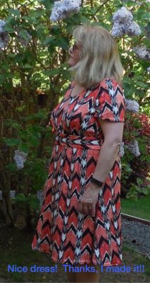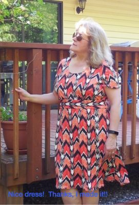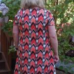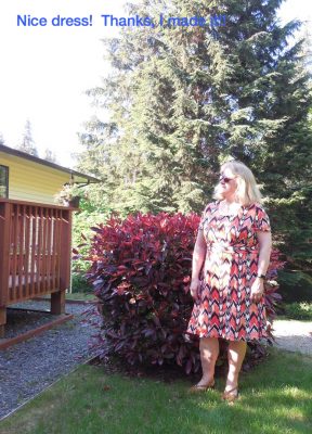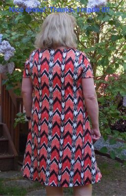 At least the pattern went together easily. Make the front, sew it together with the back and sew on the sleeves. Then sew up the side seams right into the sleeve seam. Oh! Before I forget. I left the back zipper out, just placing the back on the fold, as this was a really stretchy knit and I knew the dress would just slide on over my head.