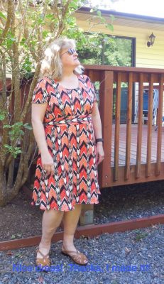 For my #sewtogetherforsummer Challenge I asked you which fabric I should use for my wrap dress, you all voted on it here. Since this Orange knit fabric was the runner up by a close margin, I thought I would use it next for my McCall’s M5974, view A. A reader was curious to know how I liked this pattern… and I just want to tell you I LOVED it! It went together very easily. I might just make another, except next time I would use a more stable knit than I did this time. The Orange knit I used was in reality more suitable for activewear. But it survived, and so did I!