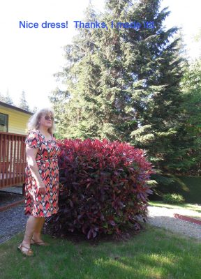 I do like this fabric. But this is the first time I have had Orange in my closet. I guess it is okay for the warm, sunny summer months? It was just beautiful outside when I started taking photos of my finished Orange dress, until the wind picked up!
