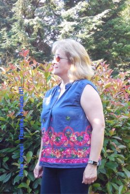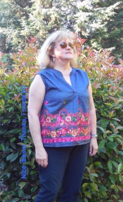 This is the last of my lovely denim border print fabric. 🙁 I’ve already made a pair of summer cropped pants with it, details here. I had just enough left to squeeze a top out of it!