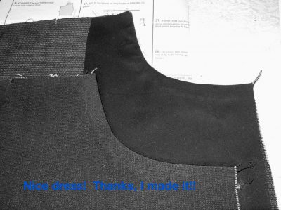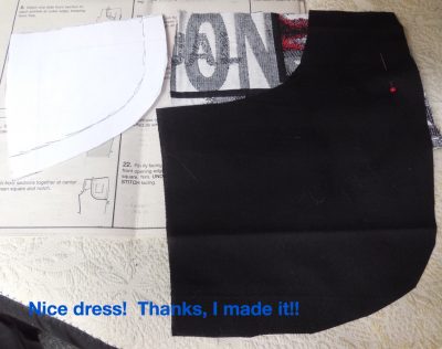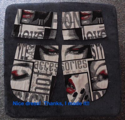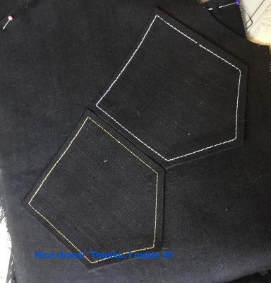 Here’s the pocket lining piece sewn up with the black cotton and the white and black print denim. I had to draw up that little insert piece myself but it wasn’t difficult because I followed the curve of the other pattern pieces.