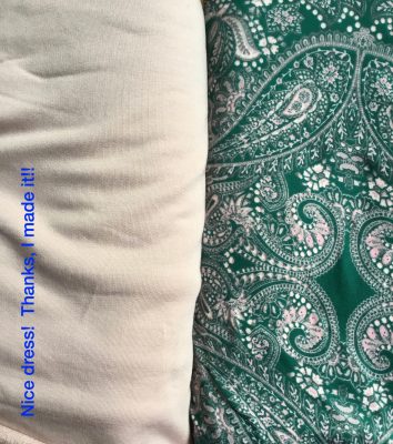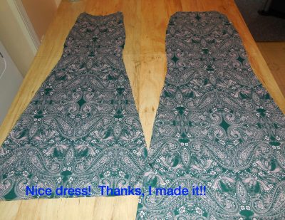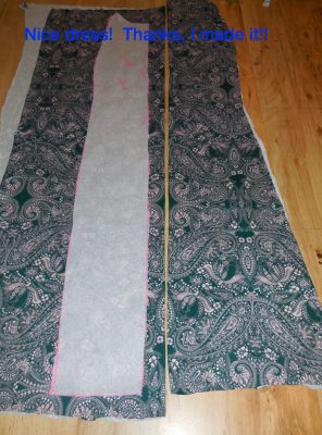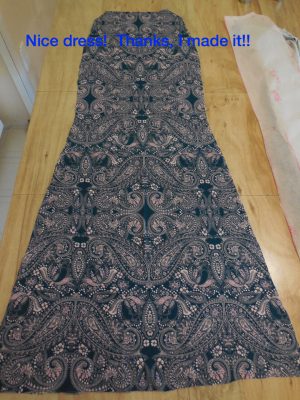 I had to chose which part of the paisley design I wanted for the centre in the front and back of my dress. Once I decided on the front, I cut the back on the same design line. Looking at these photos now, I’m hoping I don’t end up with some unfortunate pattern placement!