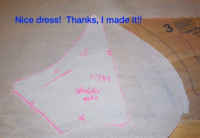 I am absolutely in love with my fabrics. I will make the sides the “blush” fabric, along with the shoulder yokes … for now anyway. I have lots of fabric so I can play with the shape of the shoulder yokes to see if I can get mine the same as the Designer Original. The centres of the dress will be this jade green/blush paisley … that should take care of the colour blocking. I had a heck of a time when tracing my pattern pieces … I forgot how to spell “shoulder”! 🙂