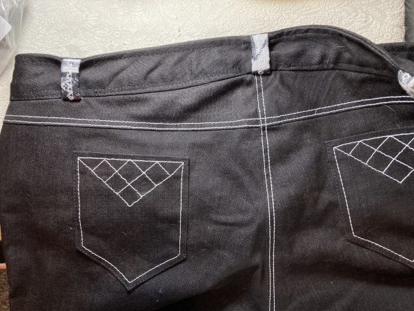 I got this far with them in August 2019, not quite sure why I stopped. There certainly wasn’t much left to sew up! The belt loops? waistband? hemming? Was this project doomed?