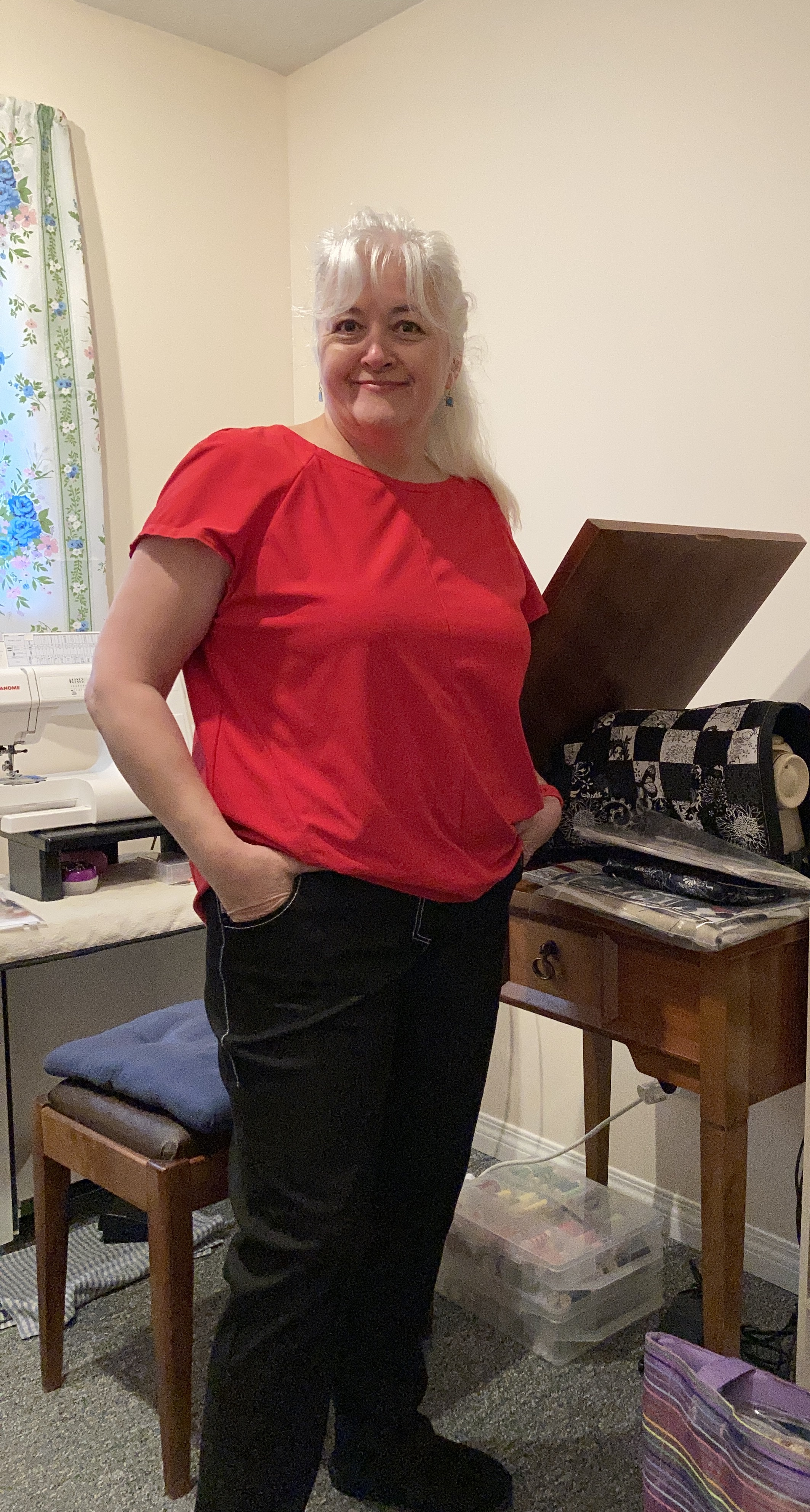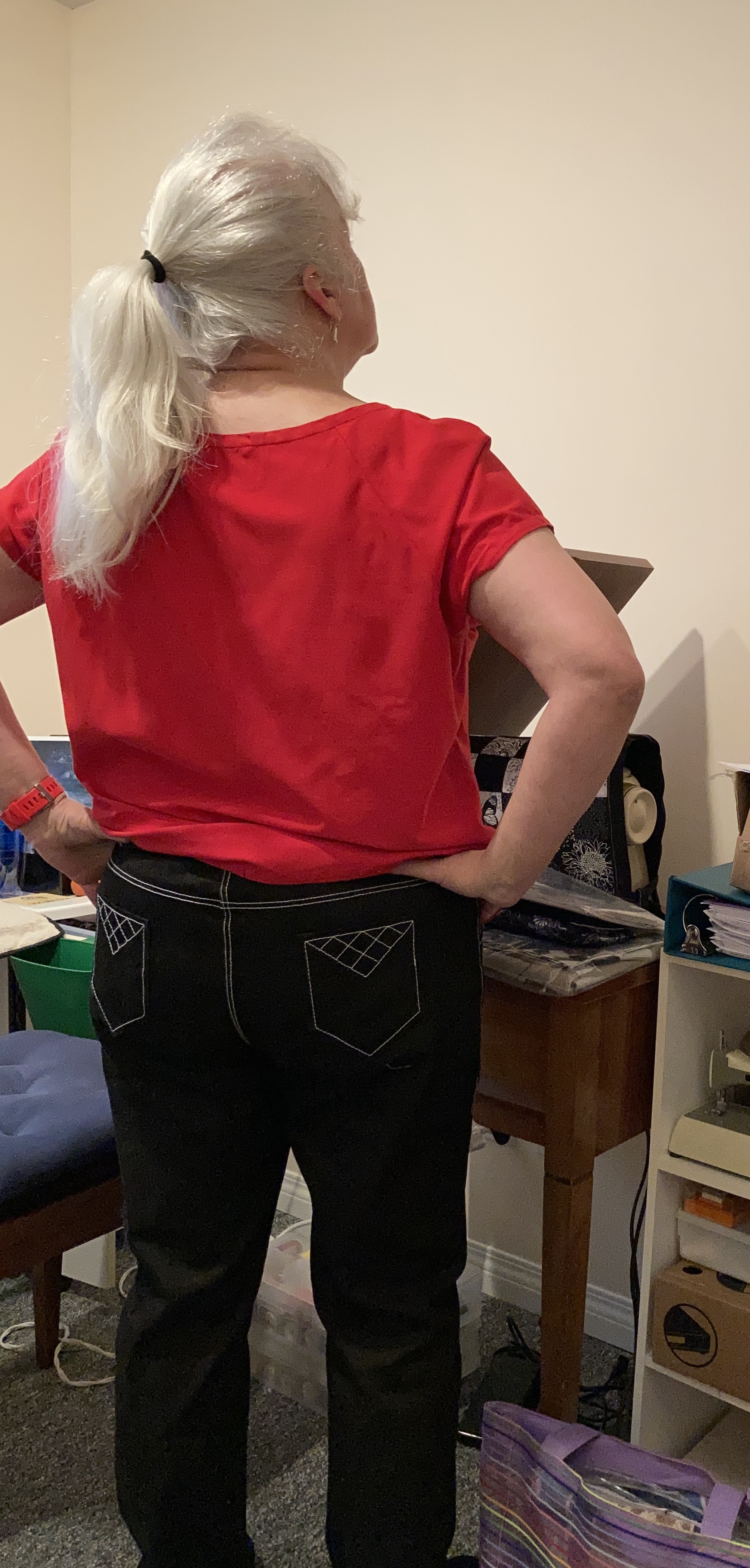 So here is the final look, in my sewing room to avoid all the clouds and rain outside … A little difficult to see the details on these black denim jeans, but amazingly enough you CAN see every single cat hair that I have picked up on them!