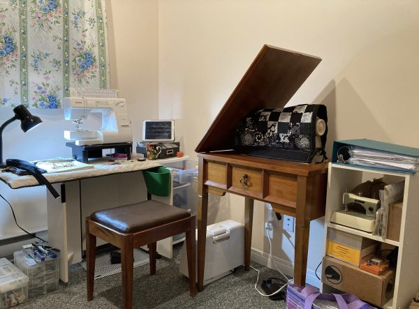 Now that all my sewing machines and supplies have been moved into my new sewing space and I can shut the door to keep the cats out, I can finally be “cat free” … well no, not quite, Simon still likes to paw at the door until I let him in. Yes, I have given in and he has his own chair beside me!