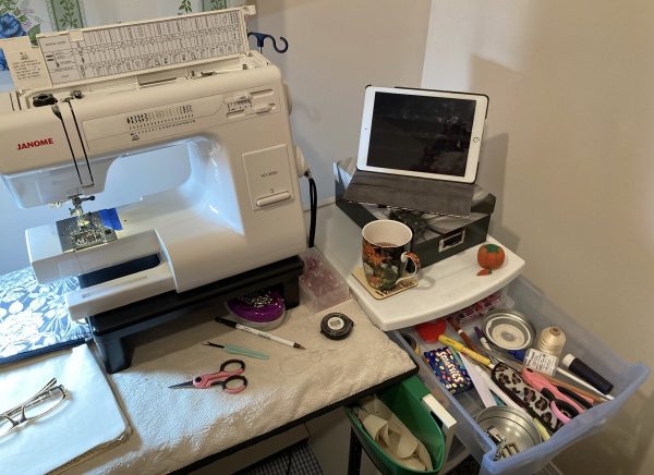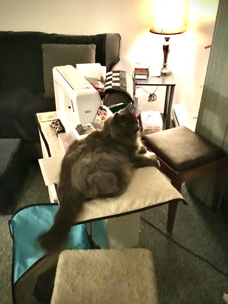 I’ve definitely gotten used to my new sewing space. For years, my sewing machine sat on a wheeled cabinet in a corner of the family room in front of the patio window amongst the cat posts. It was a nice view and I loved the convenience of the wheeled cabinet. Although I did, quite often, have to remove a cat or two from my sewing cabinet in order to sew.