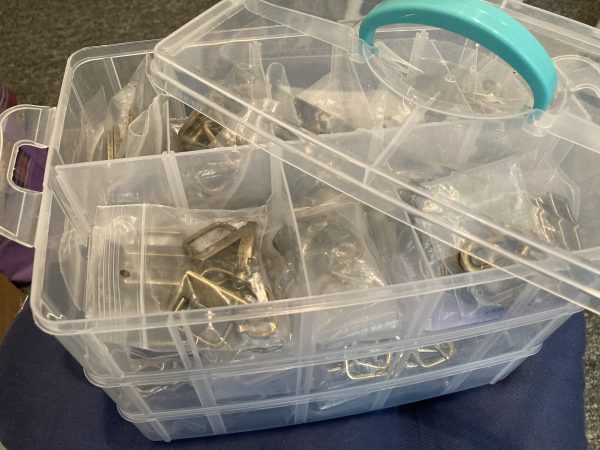 These craft storage containers are handy for bag hardware, sewing notions and thread. I have to keep my thread hidden from the cats, especially Simon, as he likes to eat it! I don’t know how I ended up with four spools of beige #811 and only one spool of black. Maybe now that I can actually SEE what I have I will know what I am short of.
