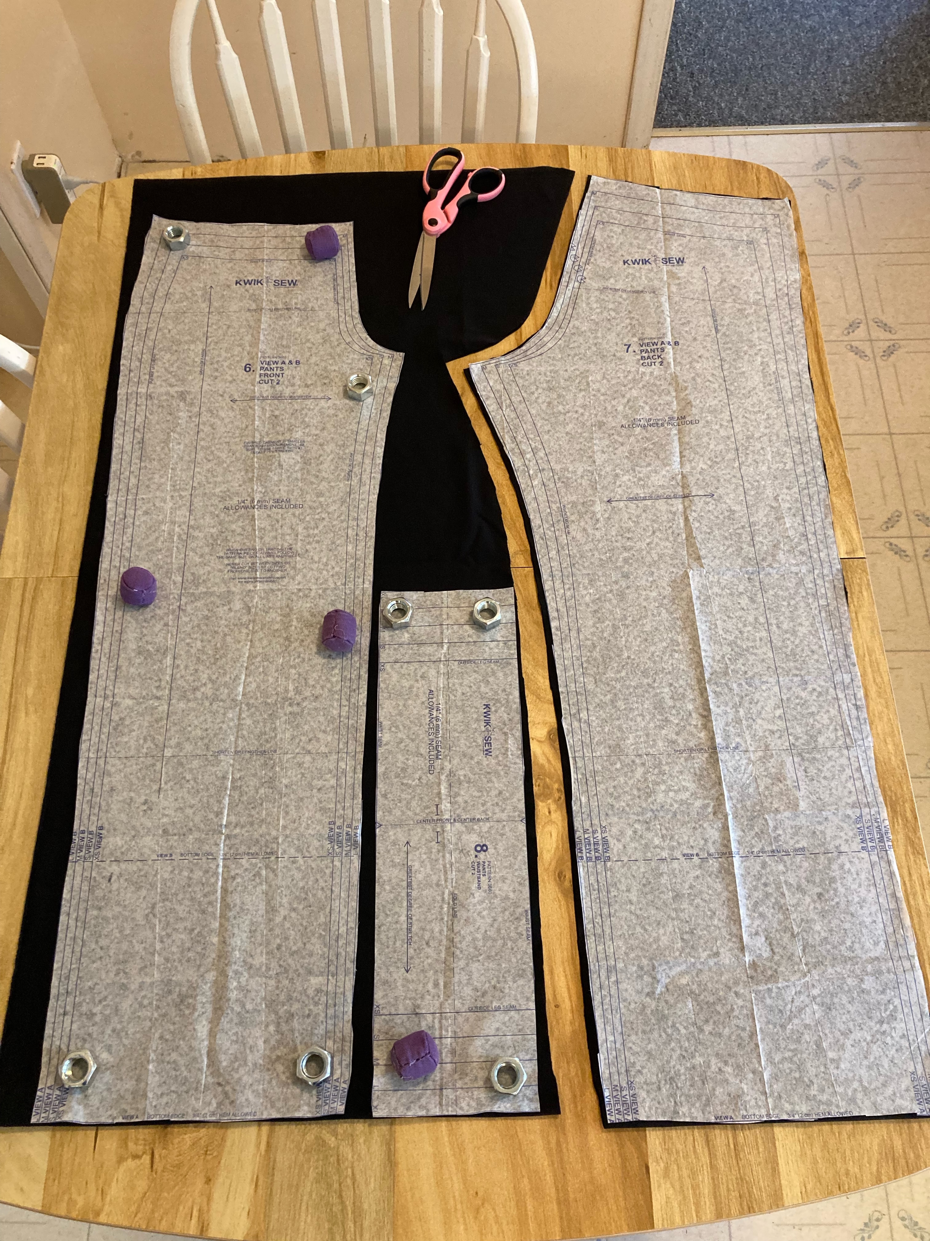 Cutting out the fabric was easy enough … I cheated and had four layers on my table at once so that I would end up with the proper number of pattern pieces TWICE. (I’ll be making two pairs of yoga pants.)