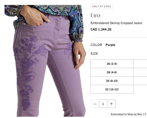 I also wanted these jeans, also by Etro, for $1,344.26 CAN. I was in love with the embroidery. Although I don’t have an embroidery machine, I do have a Janome MC8200 QCP SE with a lot of fancy stitch choices. I figured I could find some appliqué and a fancy stitch of two to spiffy up my denim.