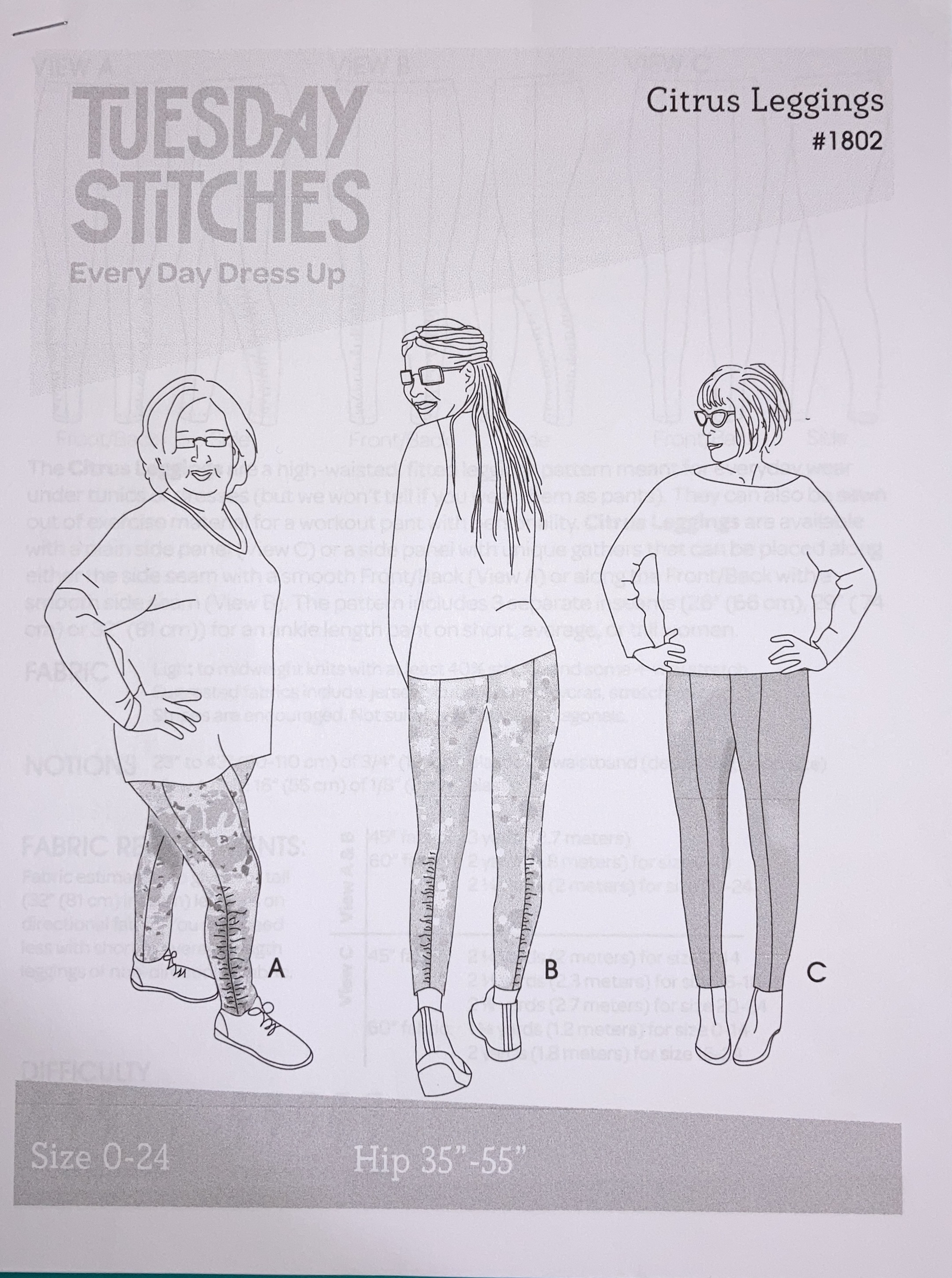 Now I need some leggings for under my Tunic Dress! 🙂 I have had the Citrus Leggings Pattern from Tuesday Stitches for a while now and have made them many times! I tried finding the shop link for you, but I can’t! Any ideas where they went? Hopefully they have just moved to a new site and we have not lost another wonderful Indie Pattern Designer! Here is a photo of the line drawing, if that helps. I am choosing another fabric from my stash, this Black 92% polyester 8% spandex from Our Social Fabric. You really should check out this supplier of deadstock fabrics!