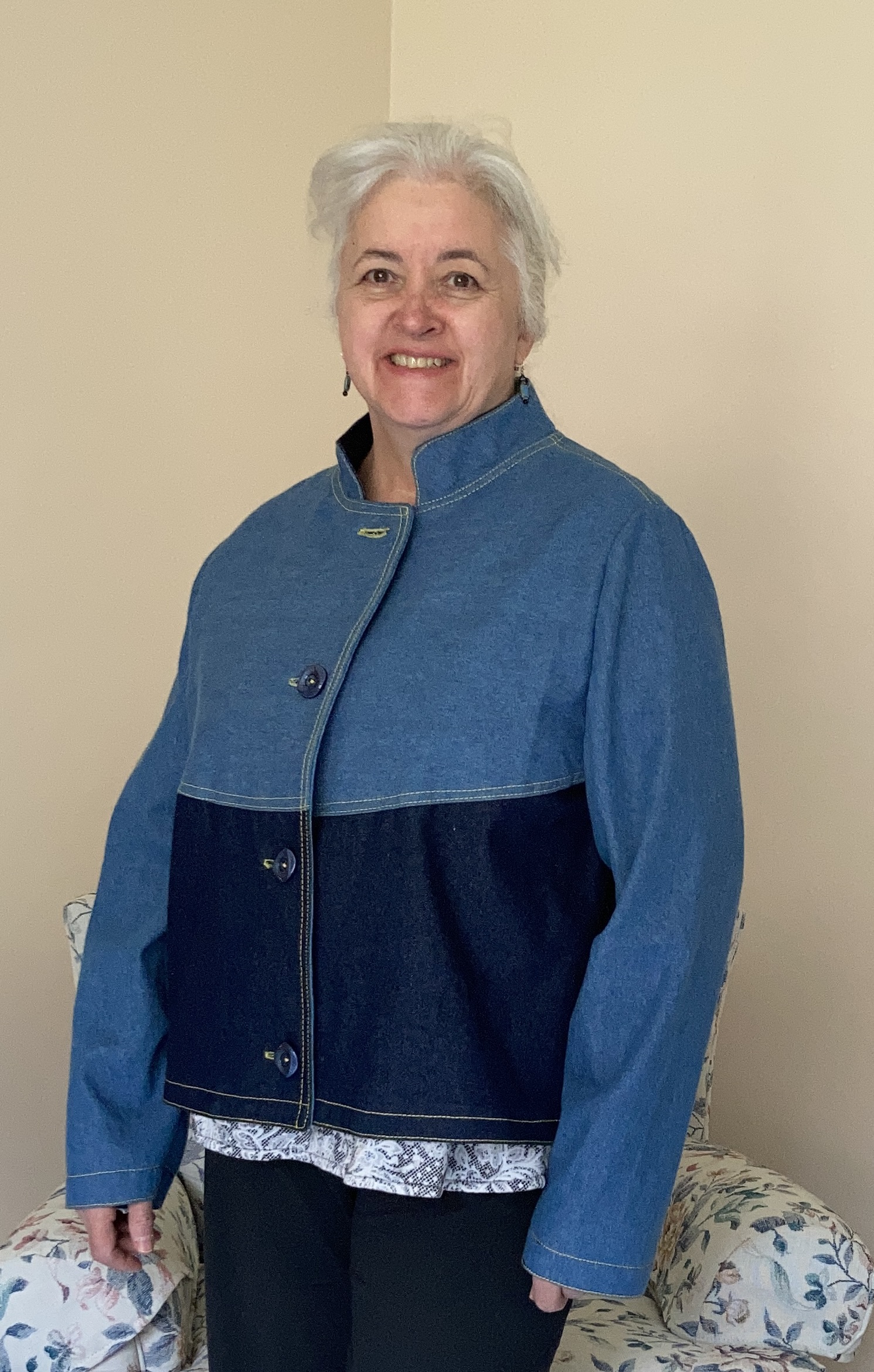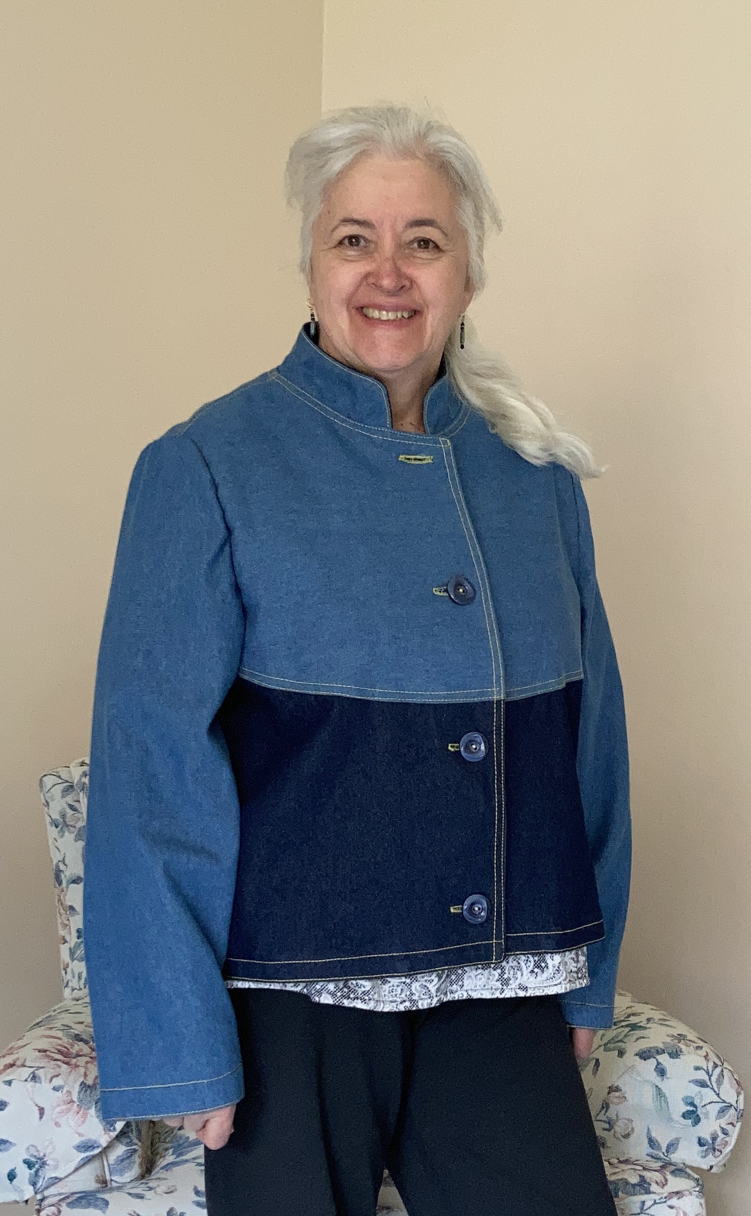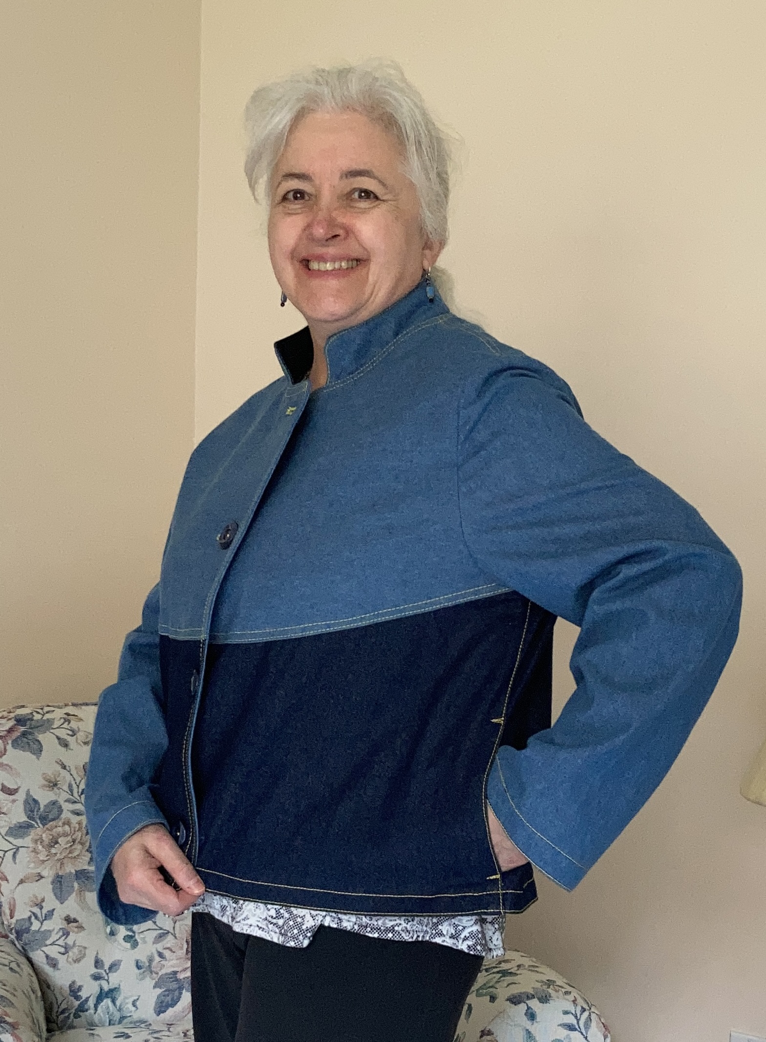 Here she is, on me, for perspective! Hidden side pockets, topstitched back, and the front with topstitching and those fabulous buttons! I swear I keep forgetting to check the sleeve length on my jackets. It’s fine for winter ones because I always hide my hands up inside the sleeves anyway! These will be super easy to just fold up again and topstitch down. The resulting thick cuff will give some shape to the sleeves. Have you ever finished a garment, tried it on and groaned…. forgot to check the fit on that! Oh well!