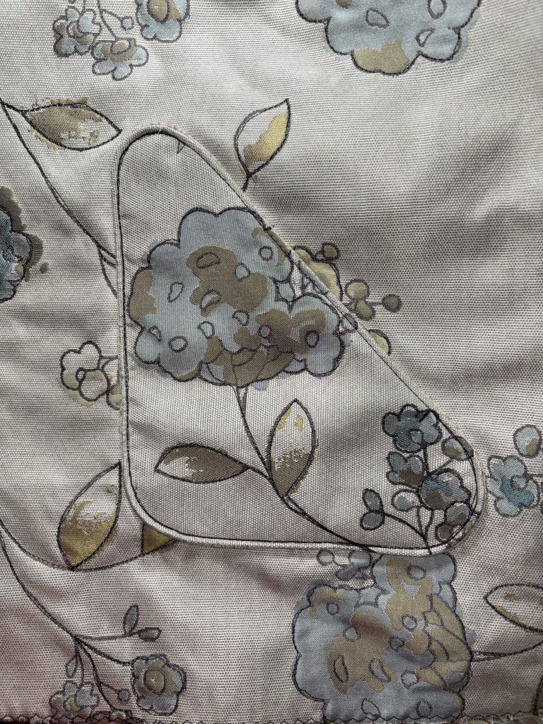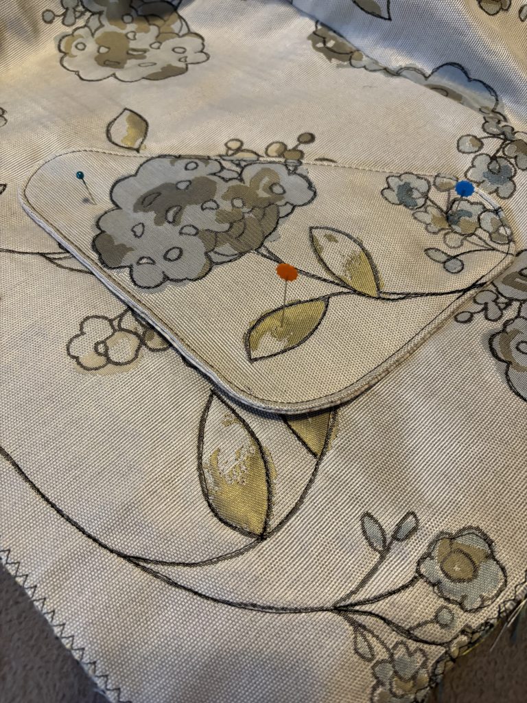 So where did I leave off… all the bits and pieces were put together and the quilting was done. I only followed the line of the flowers and the leaves when quilting. The pockets were sewn on with no fuss. I double stitched around because I wanted their shape to be obvious.